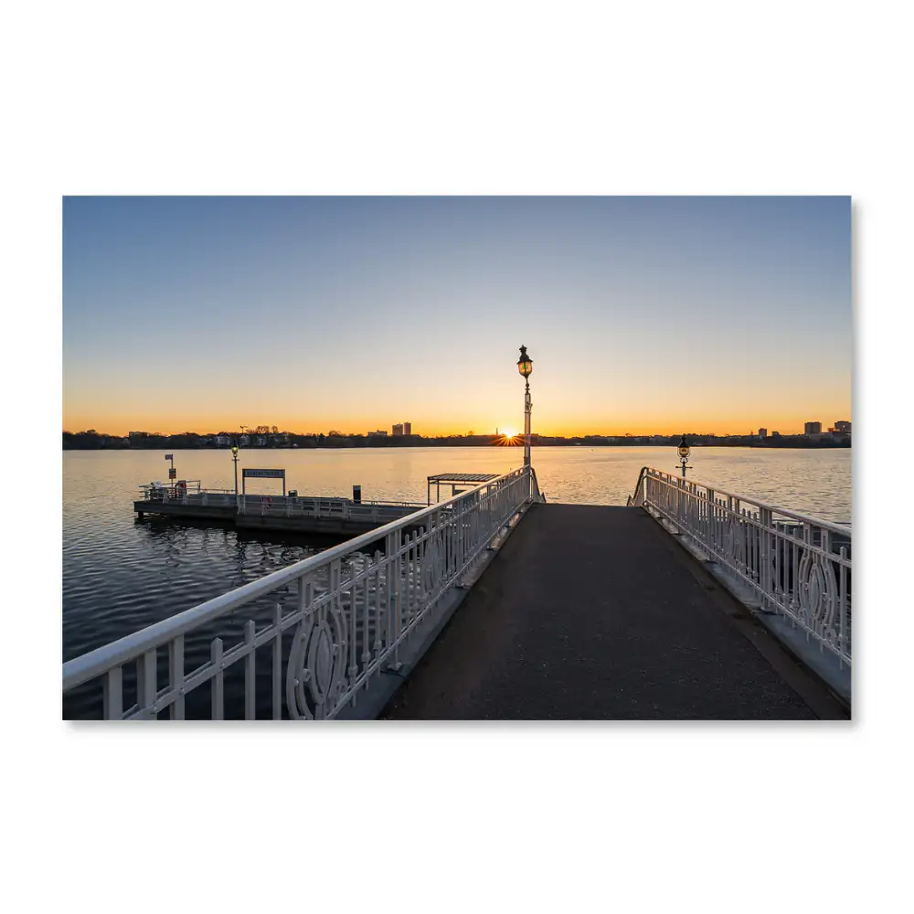 Dieses Hamburg Bild zeigt den Anleger Rabenstraße an der Hamburger Außenalster zum Sonnenaufgang. Die weiße Brüstung führt den Blick in Richtung Wasser, wo die Sonne mit einem Sonnenstern am Horizont erscheint. Das klare Morgenlicht betont die Strukturen und sorgt für eine ruhige, ausgewogene Stimmung. Ein klassischer Blick auf die Alster am frühen Tag.