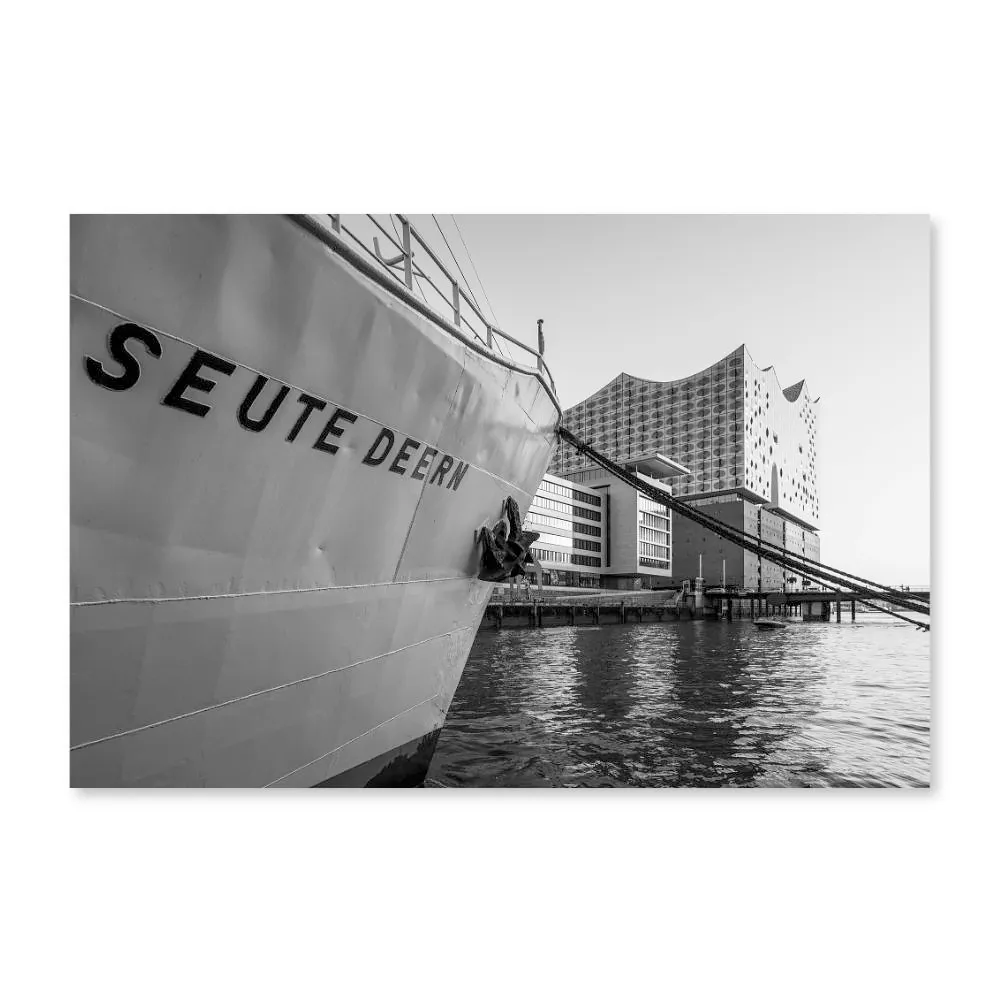 Diese Aufnahme zeigt den Bug der „Seute Deern“ im Hamburger Hafen. Im Hintergrund erhebt sich die Elbphilharmonie mit ihrer markanten Fassade. Die Schwarz-Weiß-Darstellung betont die klaren Formen und Kontraste zwischen Schiff, Wasser und Architektur. Dieses Bild verbindet maritime Tradition mit moderner Baukunst.