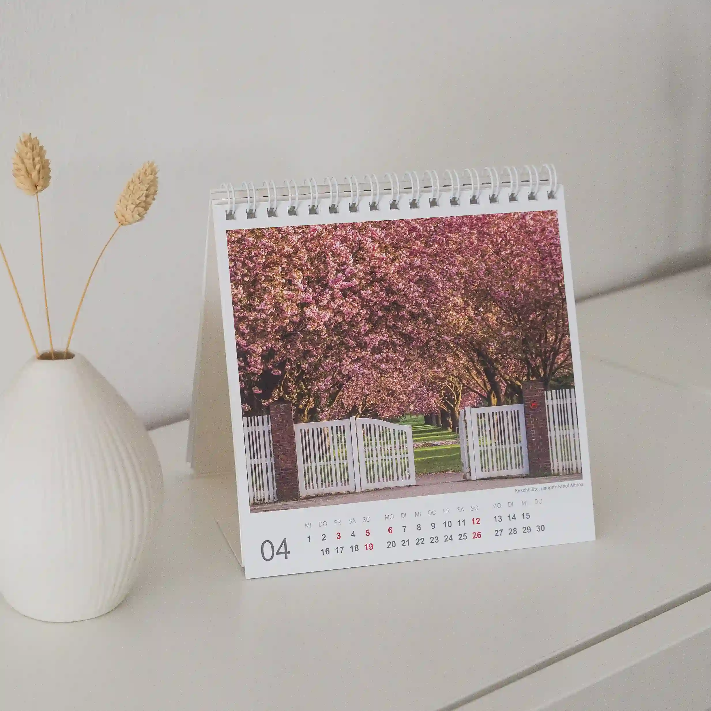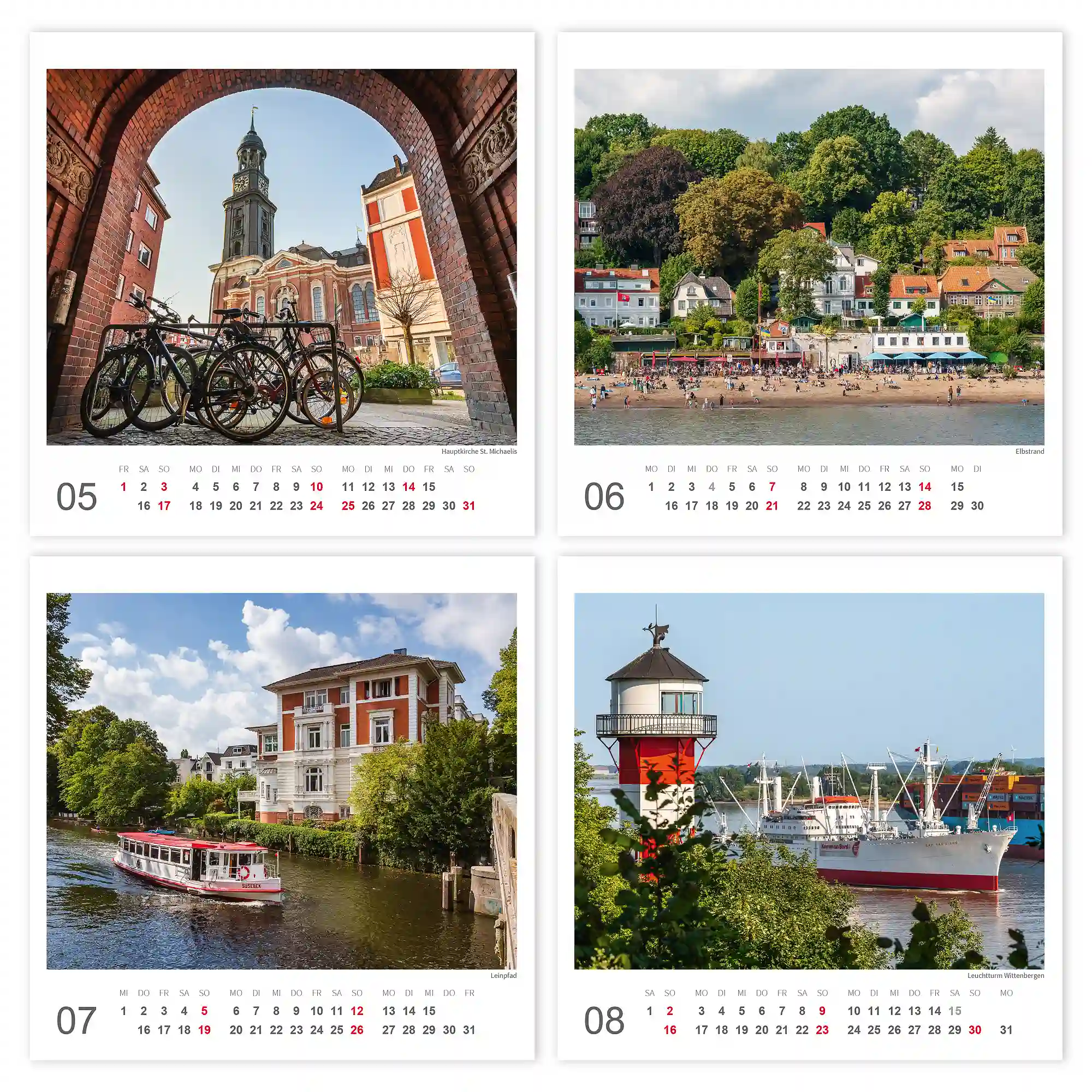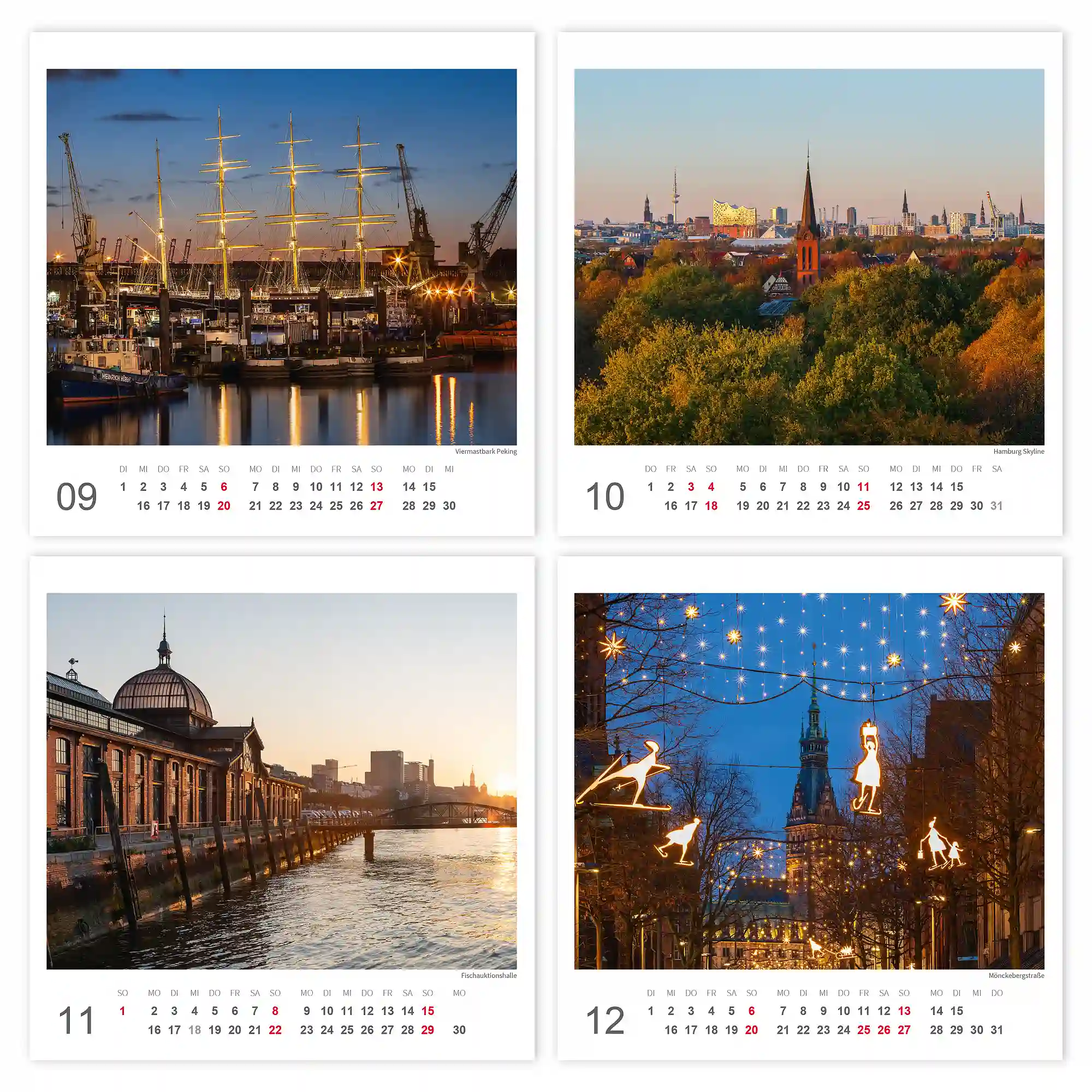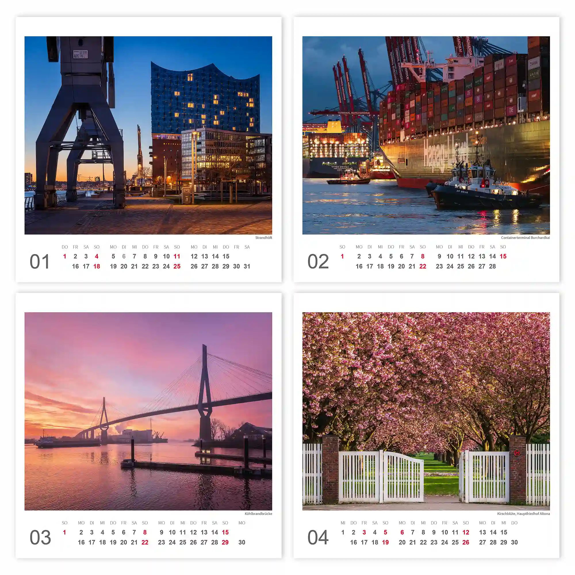 Der Hamburg Kalender im Format 15×15 cm verfügt über eine auffaltbare Stütze und wird in hochwertigem Qualitätsdruck auf mattem 250g Bilderdruckpapier hergestellt. Jeder Kalender ist mit einer weißen Spiralbindung versehen. Auf der letzten Seite (14 Seiten inkl. Deckblatt) befindet sich eine Übersichtsvorschau aller Monatsmotive und Feiertage.