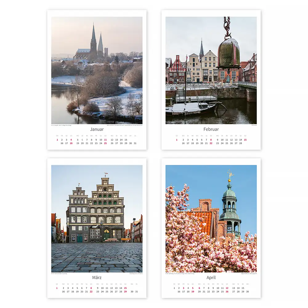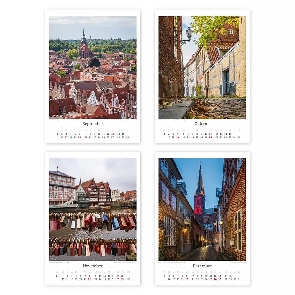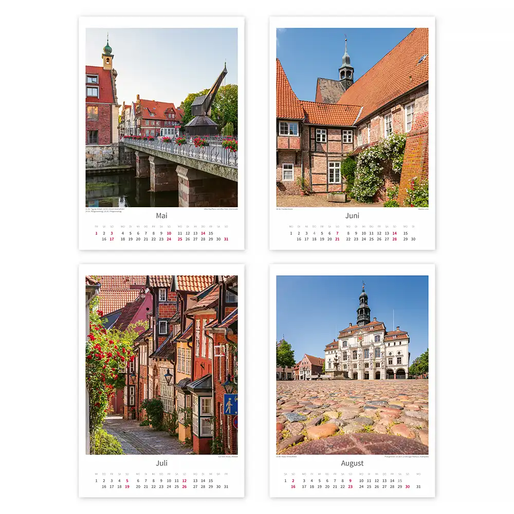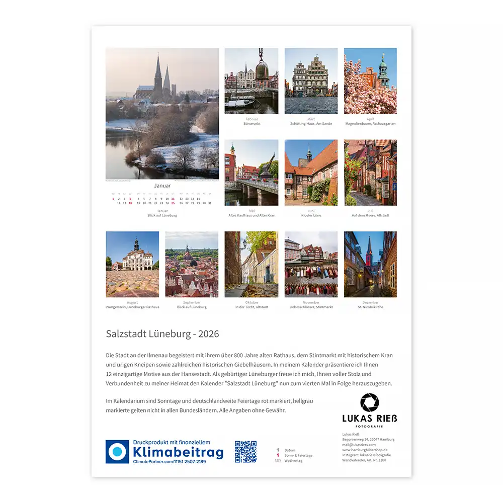 Alle Motive im Wandkalender stammen aus meiner eigenen fotografischen Arbeit vor Ort und zeigen Lüneburg im Frühling, Sommer, Herbst und Winter. Der Kalender erscheint bereits zum vierten Mal und wird in bewährter Qualität gedruckt.